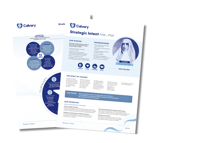 The Spirit of Calvary expresses how we care for each other, and how we care for our patients, our residents and our clients by ‘being for others’.